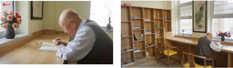 在烏蘭美康養(yǎng)院的圖書室里,人們常常會(huì)看到一位老人拿著放大鏡在埋頭讀書,一讀就是2小時(shí)。談及爺爺?shù)拈喿x愛好,老人家興奮地說:“我每天早上起來,在康養(yǎng)院內(nèi)散散步。九點(diǎn)左右就去康復(fù)訓(xùn)練室里用按摩椅活動(dòng)活動(dòng)筋骨,九點(diǎn)半左右我就去圖書室了,一般看兩小時(shí)的書。每天中午和晚上睡覺前,我是一定要看一小時(shí)書的,這已經(jīng)成為了生活‘必需品’。”不少人感嘆王爺爺?shù)淖月桑麉s打趣道:“我也是勞逸結(jié)合!午睡后,我會(huì)到活動(dòng)室打兩小時(shí)的麻將。”